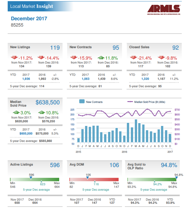 /Here is a look at Scottsdale, 85255 zip code real estate market statistics for December. New listings are down 11.2% from November with a total of 134 new listings vs. 119 in December. New contracts were also down in December by 15.9% from last month and up 11.8% from December 2016. However, the median sold price of $638,500 has gone up when compared to December of last year which was $576,250.